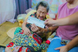 Centenarian Lourdes Abaygar of Taculing receives her ₱90,000 cash incentive from the Bacolod City Government completing her full ₱100,000 benefit under the Centenarian Benefit Program at her residence on February 25.*