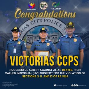 The City of Victorias extended its “heartfelt congratulations” to the Victorias City Police Station, headed by PLTCOL TERENCE PAUL STA. ANA, for the successful arrest of alias Dexter, a High-Valued Individual (HVI) suspect for violations of Sections 5, 11, and 15 of Republic Act No. 9165.