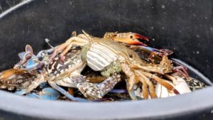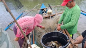 A senior citizen couple made a day’s work using traditional methods of catching blue swimming and soft shell crabs with nets along the shores of Barangay Tapong in Pulupandan town early Wednesday morning. These crabs are widely available in the region and around the country.* (James G. Toga / NDB photos)