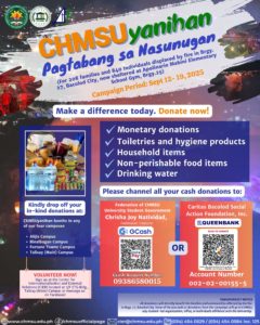In response to this tragedy, the university is calling on the compassion and generosity of its community through the CHMSUyanihan: Pagtabang sa Nasunugan initiative, which will run from September 12 to 19, 2025, aimed at extending aid to 208 affected families or 840 individuals.