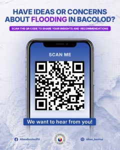 “As we prepare for the Bacolod Flood Control Summit, we invite you to share your experiences, suggestions, and recommendations through this form so it can be encoded and included in the upcoming flood summit. Your input will help guide real and doable actions for a safer, flood-resilient Bacolod,” Rep. Benitez said, referring to the QR link below.*
