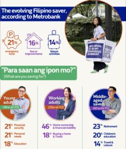 A recent Metrobank survey in October found that Filipinos’ reasons for saving evolve as they move through different life stages. Younger adults tend to focus on financial security and personal needs, working adults prioritize buying a home or funding travel, and middle-aged savers concentrate on retirement and their children’s education.